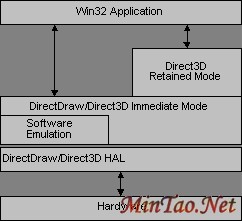 二、 Direct3D Direct3D类对象可以说是DirectX下最重要的同时也是最复杂的对象集合。基本说来,Direct3D可以分为立即模式( Immediate Mode)和保留模式(Retained Mode)。其中保留模式是一种高级3D API编程接口,它是为需要快速开发Direct 3D应用的程序员所准备的。而立即模式是一种低级3D API编程接口,它为需要开发高性能游戏或者多媒体应用的程序员提供了在较低级别上同图形加速硬件打交道的与设备无关的接口。Direct3D的保留模式是建立在立即模式基础之上的,如下图所示: