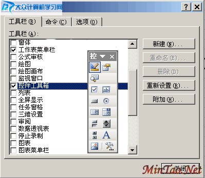 选择“工具栏”选项卡,之后在里面选择“控件工具箱”,按图中所示√选中,自然会弹出控件工具箱工具栏,之后点“关闭”;