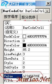 若要修改条形码下端的数字,可右击插入的条形码,选择“属性”命令,此时出现“条形码属性”界面(如下图),在Value值中输入我们需要的条形码数字,此时看到的条形码数字并未更改,甚至预览时也看不到修改的结果,此时不要着急,先将文档保存后退出,再次打开该文档时即可看到修改后的结果。