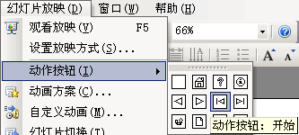 首先,随便选择一张幻灯片,然后,执行菜单操作:“幻灯片放映”→“动作按钮”,之后弹出动作按钮的菜单面板,如下图!