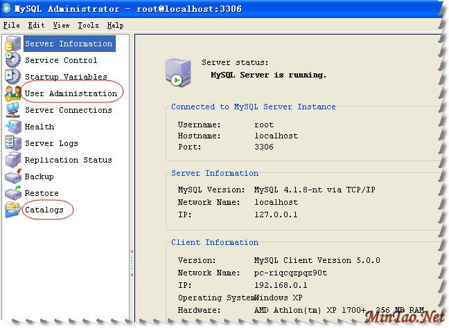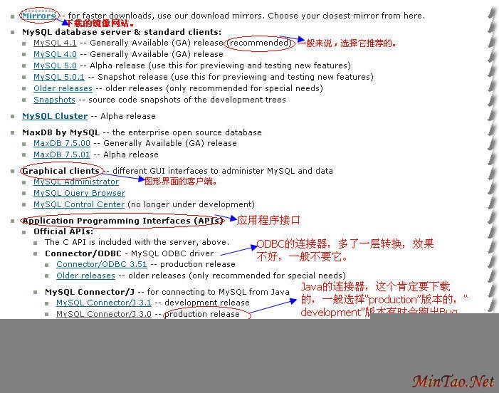 一、MySQL下载与安装    1、下载介绍       MySQL相信大家一定听说过,如果不知道它是干什么的,可以去google一下。     MySQL的大本营:http://www.mysql.com/     MySQL的下载地址:http://dev.mysql.com/downloads/   因为要从这个地址下载不少东东,所以详细分析一下这个网页。         ● 关于镜像网站,没有大陆的,有香港和台湾的。选择它,是为了加快下载速度,不过也不是绝对的,我经常就从北美的镜像下载,速度反而更快些。    ● MySQL数据库服务器  这里我选择MySQL 4.1版本。版本太低,许多新特性用不上;太高,测试还没有完善,容易出Bug。这里选择它推荐的。      点击这个链接,进入下载页面,可以看到,当前版本是4.1.8。找到“Windows downloads”,如图,因为我使用的是Windows平台。这里我选择“Without installer (unzip in C:\)”这个版本,因为我喜欢不需要安装的软件,用的不高兴,随时可以直接删除,当然需要自己配置一下才能使用。    点击“Pick a mirror”,进入一个页面,那里的表格可以不填,直接选择一个链接下载它就可以了。下载后的文件名是“mysql-4.1.8-win-noinstall.zip”,大小是35.2M。     ● 关于“Graphical clients” 图形界面的客户端,选择一个吧,可以进行图形化操作,何乐而不为?只不过以前我一直用“MySQL Control Center”的,现在却不开发了。选择“MySQL Administrator”吧,下载后的文件名是“mysql-administrator-1.0.19-win-noinstall.zip”(这里我选择的是不需要安装版本),大小是4.5M。      同样也选择“MySQL Query Browser”,它是来查询的。下载后的文件名是“mysql-query-browser-1.1.5-win-noinstall.zip”(不需要安装版本),大小是4.5M。      关于这方面的软件比较多,如:MySQL-Front,EMS MySQL Manager等,比较好用,不过它们是要Money的。   ● “Application Programming Interfaces (APIs) ” 应用程序接口  由于我主要是面向Java应用,所以这里就选择“MySQL Connector/J ”,版本选择“MySQL Connector/J 3.0”,因为它是“Procdution”版本。下载后的文件名是“mysql-connector-java-3.0.16-ga.zip”,大小是1.2M。     2、安装MySQL     · 找到下载后的mysql-4.1.8-win-noinstall.zip,解压到D盘,是一个“mysql-4.1.8-win”文件夹,这里我把它改名为“mysql”,因为我不喜欢带版本号。即这时是“D:\mysql”目录,这个目录下有一个“data”目录,这里就是存放数据的地方。为了方便备份和升级,最好把它放在其它地方。这里我在D盘新建一个目录“mysql-data”,然后把“D:\mysql”目录下的“data”子目录剪切到“D:\mysql-data”目录中。      ·新建一个“my.ini”文件,注意后缀名是“ini”。内容如下:        E:\WINDOWS\my.ini [WinMySQLAdmin]