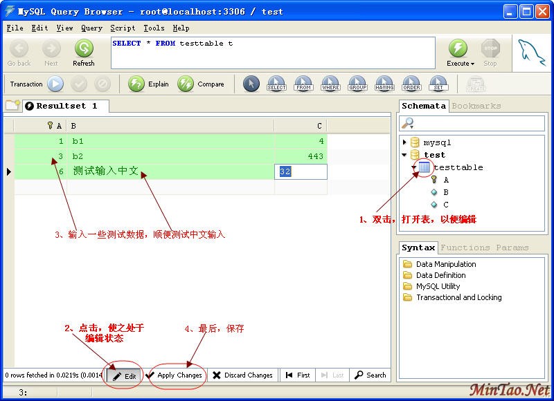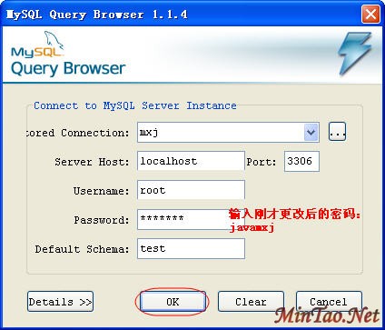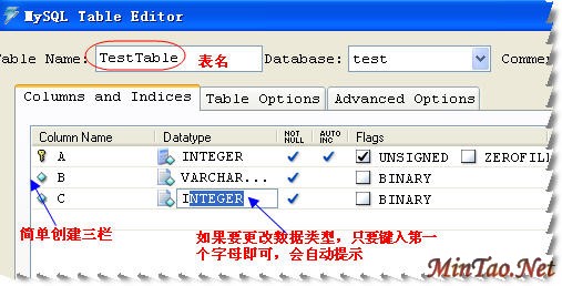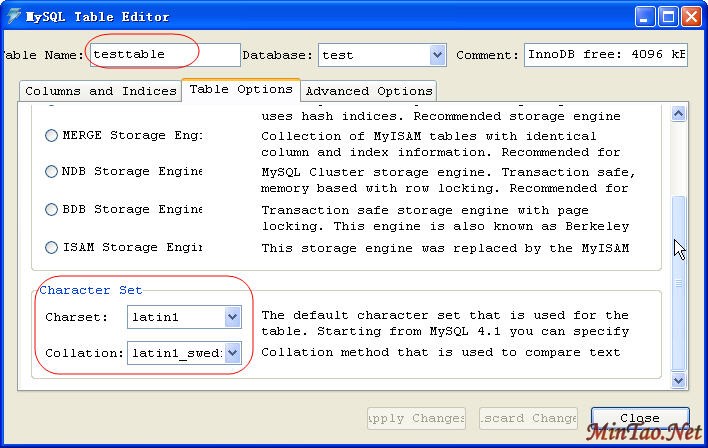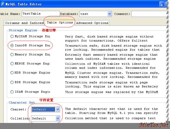 · 移出mysql服务          mysqld-nt --remove    (如果你不再需要MySQL了,先停止MySQL服务,然后再移出MySQL服务,最后删除MySQL安装目录即可)       二、基本操作     ● 准备工作     在D盘建立一个mysql-software的目录,把刚才下载的 mysql-administrator-1.0.19-win-noinstall.zip 复制到这个子目录中,解压,得到一个 MySQL Administrator 1.0 的目录。   同样如此操作 mysql-query-browser-1.1.5-win-noinstall.zip,得到一个 MySQL Query Browser 1.1 的目录。      ● 启动服务:   · 双击D:\mysql-software\MySQL Administrator 1.0 目录下的 MySQLSystemTrayMonitor.exe,这时会在任务栏右侧出现一个图标。点击“Start Instance”,运行MySQL。   · 然后双击 D:\mysql-software\MySQL Administrator 1.0 目录中的 MySQLAdministrator.exe,或者直接点击上面右键菜单中的“MySQL Administrator ”:   · 创建一个连接名,可以随便填,这里是“mxj”,用户名:root,密码空着。这是因为mysql默认有一个没有密码的root帐号。点击“OK”,出现管理窗口: 这没什么好说的,英文也很简单。只谈谈上面勾选的两项。   ● 更改密码 好了,我的root帐号的密码设置为:javamxj   最后,点击“Apply Change”。   ● 初始的数据库   上图可以看到,初始有两个数据库,mysql库中含有各种配置信息,不要在这个库中进行表操作。 test库初始是空的。另外,建立表时,不要和mysql库中的表名取名相同,以免冲突。     ● 数据创建与查询(兼谈谈字符编码)   ·现在来到查询浏览器,还是右击右下角“MySQL System Tray Monitor”图标,从中选择“MySQL Query Browser”,因为已经更改过root的密码,所以要填入新密码。   · 进入主界面,右击test数据库,创建一个新表。     ·  如下简单创建一个表   · 切换到“Table Options”:    如果了解数据库的话,这些应该是很熟悉的,不多说了。注意字符设置默认是“Latin1”(保存改变,再次切换到这一栏,就能看到了)。   · 填入一些测试数据:     · 关闭“MySQL Query Browser”,再重新打开它,切换到testtable表,看到了没有?刚才输入的中文变成了“??????”,为什么呢? 再次切换到“Table Options”:  知道为什么了吧,原来默认字符是“latin1”,因为MySQL是瑞典一家公司的产品。中国人看来要努力了!     ● 解决方法:   · 停止MySql服务,关闭所有与MySql相关的程序,打开Windows的系统安装目录下的 my.ini 文件,如下修改: E:\WINDOWS\my.ini [WinMySQLAdmin]