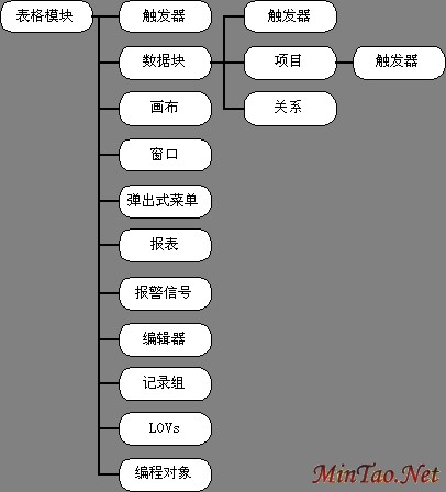 表格模块是数据库应用程序的主要组件。在内部结构中,表格是最丰富的模块,它包含许多不同类型的对象。下图显示了组成表格模块的对象的层次结构。