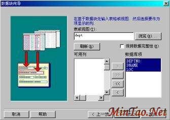 l 在“表或视图”域上输入表名:Dept,点击“刷新”按钮,就会在“可用列”看到这个表中所包含的字段。 使用“ ”和“ ”按钮,