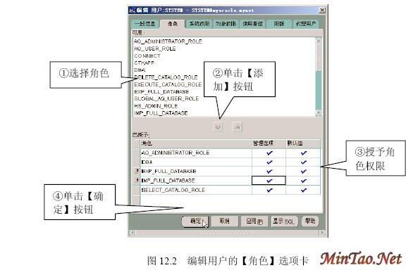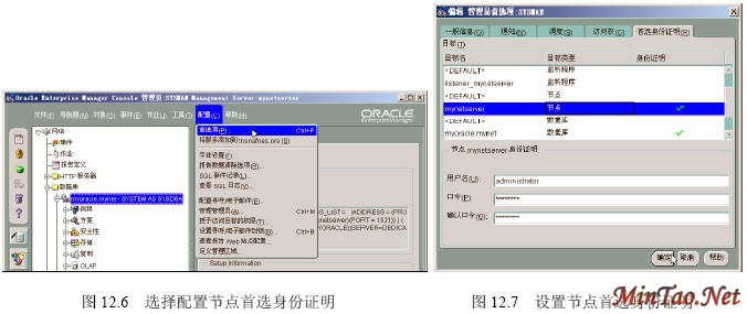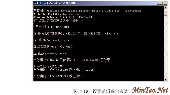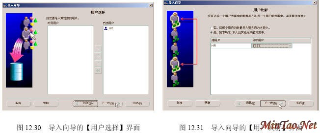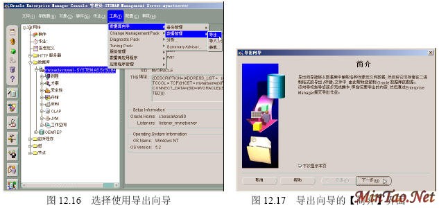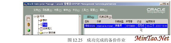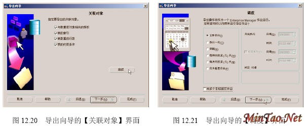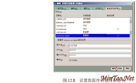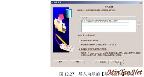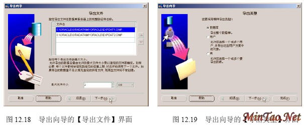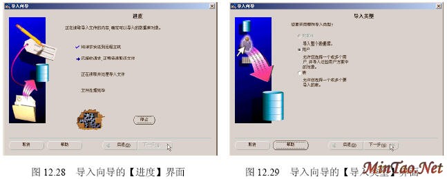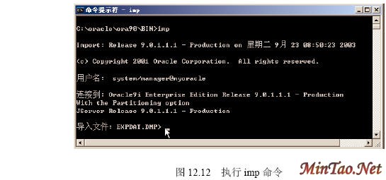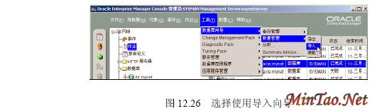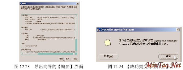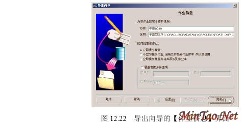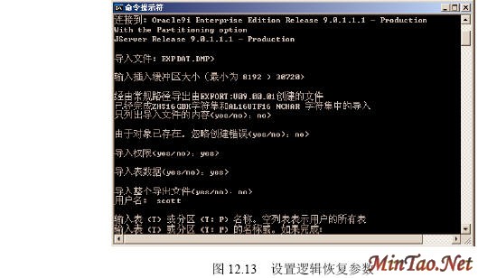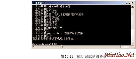 逻辑备份与恢复的前提 1. 数据库工作在归档状态 2. 给数据库管理员授予角色权限 (1)如图12.2所示的编辑用户的【角色】选项卡。 (2)在【可用】下拉列表框里选中EXP FULL DATABASE和IMP FULL DATABASE角色,单击按钮,在【已授予】列表框里出现已经授予的角色权限。 3. 给NT管理员授予批处理作业权限 (1)如图12.3所示的本地安全设置界面。 (2)出现如图12.4所示的【本地安全策略设置】界面。 (3)出现如图12.5所示的【选择用户或组】界面。 4. 设置节点的首选身份证明 (1)如图12.6所示。 (2)切换到如图12.7所示的编辑管理员首选项的【首选身份证明】选项卡。 5. 设置数据库的首选身份证明 用exp命令文件实现逻辑备份 (1)数据库连接成功后出现如图12.9所示界面。 (2)出现如图12.10所示界面。 (3)开始逻辑备份过程,出现如图12.11所示界面。 (4)在c:\oracle\ora90\bin目录下已经有名为EXPDAT.DMP的二进制文件存在。 用imp命令文件实现逻辑恢复 (1)数据库连接成功后出现如图12.12所示界面。 (2)出现如图12.13所示界面, (3)出现如图12.14所示界面表明利用imp命令文件成功完成逻辑恢复。 (4)出现如图12.15所示的界面显示其参数配置。 用导出向导实现逻辑备份 (1)如图12.16所示。 (2)出现如图12.17所示的导出向导的【简介】界面。 (3)出现如图12.18所示的导出向导的【导出文件】界面。 (4)出现如图12.19所示的导出向导的【导出类型】界面,有3种导出类型。 (5)出现如图12.20所示的导出向导的【关联对象】界面,指定要导出的关联对象。 (6)出现如图12.21所示的导出向导的【调度】界面,包括6种调度方式。 (7)出现如图12.22所示的导出向导的【作业信息】界面。 (8)出现如图12.23所示的导出向导的【概要】界面。 (9)出现如图12.24所示界面。 (10)成功完成的备份作业如图12.25所示。 用导入向导实现逻辑恢复 (1)如图12.26所示。 (2)出现导入向导的【简介】界面。 (3)出现如图12.27所示的导入向导的【导入文件】界面。 (4)出现如图12.28所示的导入向导的【进度】界面。 (5)出现如图12.29所示的导入向导的【导入类型】界面。 (6)出现如图12.30所示的导入向导的【用户选择】界面。 (7)出现如图12.31所示的导入向导的【用户映射】界面。 (8)出现如图12.32所示的导入向导的【关联对象】界面,用于设置要导入的关联对象,包括。 (9)出现导入向导的【调度】界面。 (10)出现导入向导的【作业信息】界面。 (11)出现导入向导的【概要】界面。 (12)出现作业成功提交界面。