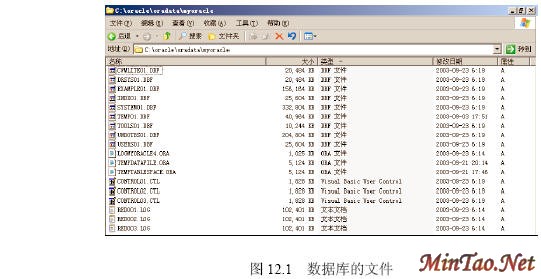 脱机备份 (1)在【企业管理器】里关闭数据库例程。 (2)利用计算机的【资源管理器】查找与数据库有关的文件。如图12.1所示。 (3)数据库的初始化文件位于c:\oracle\ora90\database目录下,名为initmyoracle.ora,将其拷贝到指定目录下。 脱机恢复 (1)在【企业管理器】里关闭数据库例程。 (2)将上述拷贝的文件重新覆盖原来的同路径同名文件就可以。