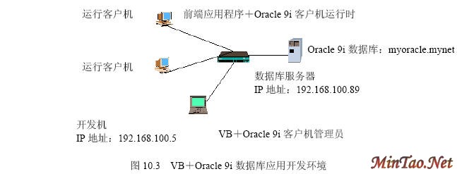 如何选择前台开发工具 如何构建开发和运行环境 一个VB+Oracle 9i的数据库应用从逻辑上看有3个组成部分。如图10.1所示。 1. 构建开发和运行客户机 在开发客户机上要进行以下工作。 (1)安装VB。 (2)安装Oralce 9i客户机,最好是管理员,这样可以及时管理后台数据库服务器上的数据。 (3)测试Oracle 9i的客户机是否能够正常连通数据库服务器。 在运行客户机上要进行如下工作。 (1)安装用VB开发好的应用程序。 (2)安装Oralce 9i客户机,最好是连接,这样终端用户不能直接操作数据库。 (3)测试Oracle 9i的客户机是否能够正常连通数据库服务器。 2. 保证网络畅通 确保网络TCP/IP协议能够畅通。 3. 构建数据库服务器 2.1节已经详细做了介绍。 环境构建实例 1.检查数据库服务器工作情况 2.安装Oracle 9i客户机 图10.2所示为Oracle 9i客户机安装步骤中的【安装类型】界面。 3.安装VB