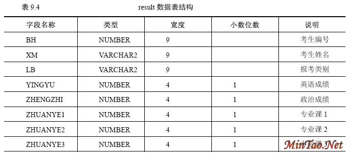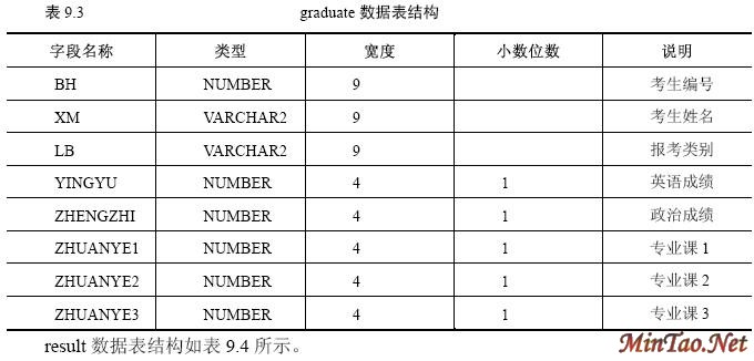 为此设计两个数据表,graduate数据表存放考生成绩,result数据表存放处理结果,PL/SQL程序完成的功能就是将graduate数据表中的数据逐行扫描,根据分数线进行判断,计算出各科总分,在result数据表中将标志字段自动添加上“录取”或“落选”。