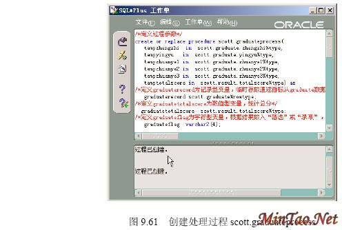 在【SQLPlus Worksheet】中执行下列PL/SQL代码,创建处理过程scott.graduateprocess。执行结果如图9.61所示。