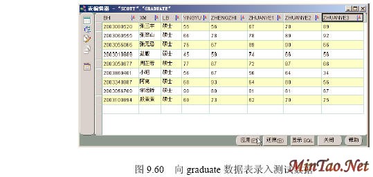 利用【表数据编辑器】向SCOTT.GRADUATE数据表录入下列实验数据。如图9.60所示。