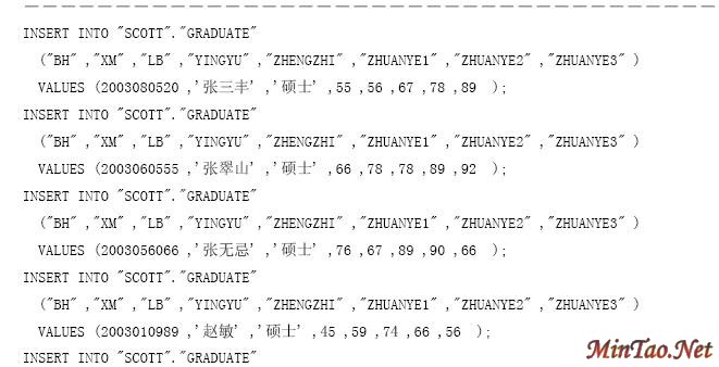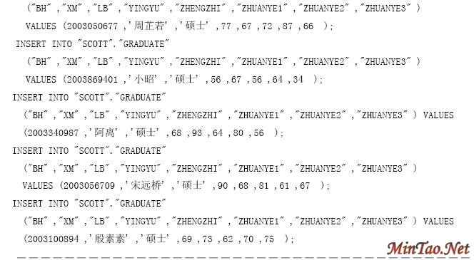 读者也可以在【SQLPlus Worksheet】中执行下列SQL代码,直接向数据表SCOTT.GRADUATE中录入测试数据。