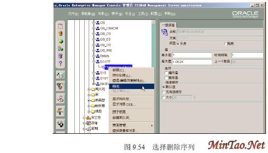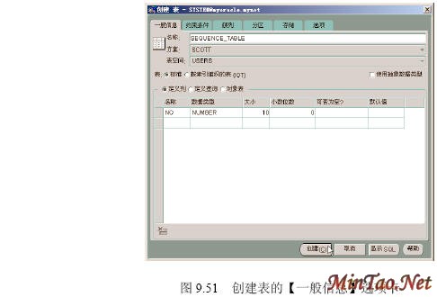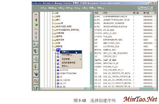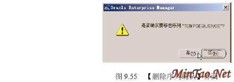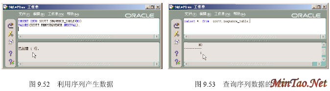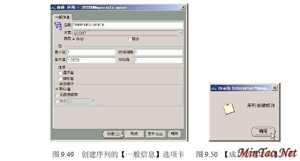 序列是Oracle 9i提供的用于按照设定的规则自动产生数据的方案对象。在某些数据表的结构中,有些字段需要这种特性。比如,对于某个学生数据表的学号关键字段,用户可以希望在录入数据时,能够自动在上一个记录的学号字段上自动加1等。由于Oracle 9i提供的16种基本数据类型并没有这样的功能,可以通过序列方案对象来实现。 序列的创建 下面介绍在【企业管理器】中如何创建序列。 (1)在【企业管理器】中选择【myoracle.mynet】/【方案】/【序列】选项,单击鼠标右键,在出现的快捷菜单里选择【创建】选项,如图9.48所示。 (2)出现如图9.49所示的创建序列的【一般信息】选项卡。 在【名称】文本框里输入待定义的序列的名称“TEMPSEQUENCE”。 在【方案】下拉列表框里选择序列所属的用户名“SCOTT”。 序列【类型】参数有两个选项。若选择【升序】单选钮,则表示将创建从初始值向最大值递增的序列,这是创建序列时的默认设置;若选择【降序】单选钮,则表示将创建从初始值向最小值递减的序列。 对【值】可以进行设置的参数如下。 在【最小值】文本框里设置序列允许的最小值。创建序列时该字段最初为空。如果单击【创建】按钮时该字段为空,则对升序序列使用默认值 1,而对降序序列使用默认值 -1026。 在【最大值】文本框里设置序列允许的最大值。创建序列时该字段最初为空。如果单击【创建】按钮后该字段为空,则将对升序序列使用默认值 1027,而对降序序列使用默认值-1。 在【时间间隔】文本框里设置递增序列递增的间隔数值(升序序列)或递减序列递减的间隔数值(降序序列)。创建序列时该字段最初为空,如果单击【创建】按钮后该字段为空,将使用默认值1,该字段只能为正整数。 在【初始值】文本框里设置序列的起始值。如果单击【创建】按钮后该字段为空,对升序序列将使用该序列默认的最小值,对降序序列将使用该序列默认的最大值。 对【选项】可以设置的参数如下。 若选择【循环值】复选框,则表示指定在达到序列最小值或最大值之后,序列应继续生成值。对升序序列来说,在达到最大值后将生成最小值。对降序序列来说,在达到最小值后将生成最大值。如果未选择该复选框,序列将在达到最小值或最大值后停止生成任何值。默认情况下是未选择状态。 若选择【排序值】复选框,则指定序列号要按请求次序生成,默认情况下是未选择状态。 在【高速缓存】中设置由数据库预分配并存储的值的数目参数。若选择【默认值】单选钮,则表示将设置默认值为 20,默认情况下选择此选项;若选择【无高速缓存】单选钮,则表示指定不预分配序列值;若选择【大小】单选钮,则表示在文本框里输入可接受的值,最小值为2,对循环序列来说,该值必须小于循环中值的个数。如果序列能够生成的值数的上限小于高速缓存大小,则高速缓存大小将自动改换为该上限数。 完成设置后单击按钮。 (3)成功创建序列后,出现如图9.50所示界面。单击“确定”按钮。 (3)读者也可以在【SQLPlus Worksheet】中执行下列SQL程序创建序列。 ――――――――――――――――――――――――――――――――――――― CREATE SEQUENCE "SCOTT"."TEMPSEQUENCE" INCREMENT BY 1 START WITH 1 MAXVALUE 1.0E28 MINVALUE 1 NOCYCLE CACHE 20 NOORDER ――――――――――――――――――――――――――――――――――――― 【配套程序位置】:第9章\ createsequence.sql。 序列的使用 下面介绍在向数据表中插入数据时如何使用序列。 (1)首先为实例建立一个数据表“SCOTT.SEQUENCE_TABLE”,为简化起见,该数据表仅包含一个类型为“NUMBER”的数据列“NO”。 在如图9.51所示的创建表的【一般信息】选项卡中进行如下设置。 在【名称】文本框中输入“SEQUENCE_TABLE”。 在【方案】下拉列表框中选择“SCOTT”。 在【表空间】下拉列表框中选择“USERS”。 在【名称】单元格中输入“NO”,在【数据类型】下拉列表框单元格中选择“NUMBER”。 完成设置后单击按钮。 (2)读者也可以在【SQLPlus Worksheet】中执行下列SQL代码创建数据表“SCOTT.SEQUENCE_TABLE”。 ――――――――――――――――――――――――――――――――――――― CREATE TABLE "SCOTT"."SEQUENCE_TABLE" ("NO" NUMBER(10) NOT NULL) TABLESPACE "USERS" ――――――――――――――――――――――――――――――――――――― 【配套程序位置】:第9章\ createsequencetable.sql。 (3)在插入新的记录时,使用刚创建的“TEMPSEQUENCE”序列来自动产生“NO”数据列的值。在【SQLPlus Worksheet】里执行下面的SQL代码,执行的结果如图9.52所示。 ――――――――――――――――――――――――――――――――――――― INSERT INTO SCOTT.SEQUENCE_TABLE(NO) VALUES(SCOTT.TEMPSEQUENCE.NEXTVAL); ――――――――――――――――――――――――――――――――――――― 【配套程序位置】:第9章\ insertsequencetable.sql。 “SCOTT.TEMPSEQUENCE.NEXTVAL”表分配下一个惟一的、可用的序列号。 执行“SCOTT.TEMPSEQUENCE.NEXTVAL”后,可以使用“SCOTT.TEMPSEQUENCE. CURRVAL”来标识上一个已经存储的序列值。 (4)在【SQLPlus Worksheet】中可以执行查询数据表“SCOTT.SEQUENCE_TABLE”数据的语句。执行结果如图9.53所示,表明序列“SCOTT.SEQUENCE”产生的值已经成功录入数据表中。 ――――――――――――――――