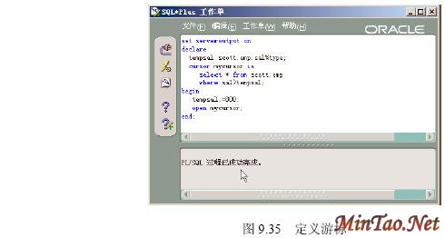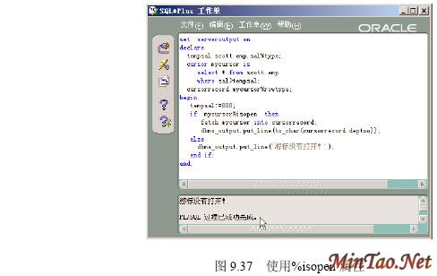 在【SQLPlus Worksheet】中执行下列PL/SQL程序,该程序利用%isopen属性判断游标是否打开。执行结果如图9.37所示。