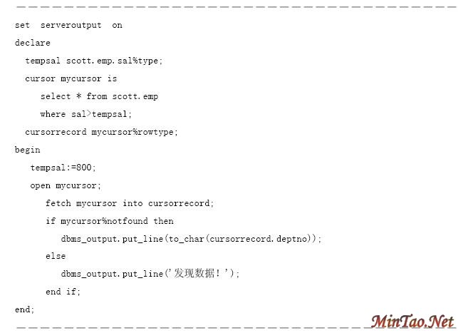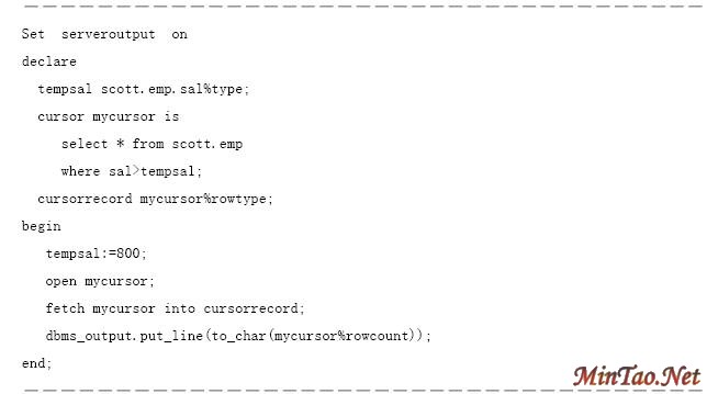 以scott用户连接数据库,在【SQLPlus Worksheet】中执行下列PL/SQL程序,该程序定义tempsal为与scott.emps数据表中的sal字段类型相同的变量,mycursor为从scott.emp数据表中提取的sal大于tempsal的数据构成的游标。