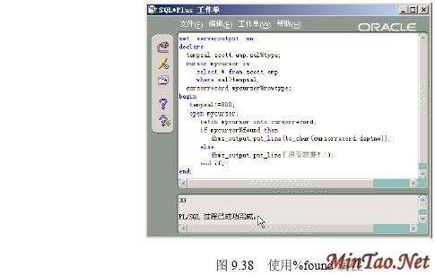 在【SQLPlus Worksheet】中执行下列PL/SQL程序。该程序利用%found属性判断游标是否有数据。
