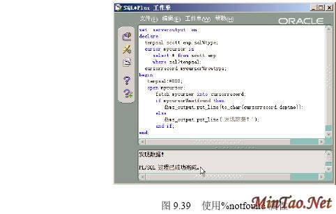 在【SQLPlus Worksheet】中执行下列PL/SQL程序。该程序利用%notfound属性判断游标是否没有数据。