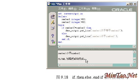 在【SQLPlus Worksheet】中执行下列PL/SQL程序,该程序判断两个整数变量的大小,输出不同的结果。执行结果如图9.18所示。