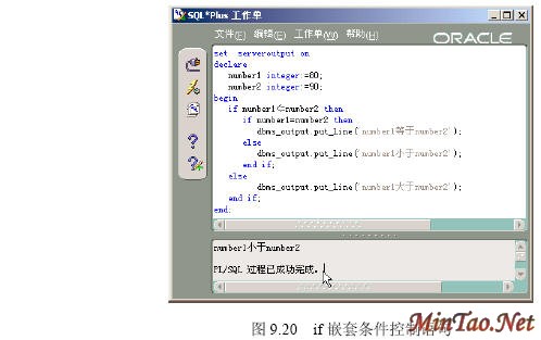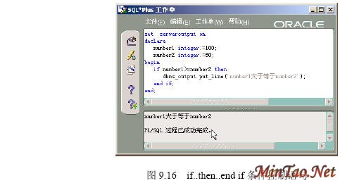 在【SQLPlus Worksheet】中执行下列PL/SQL程序,该程序判断两个整数变量的大小。 执行结果如图9.16所示。