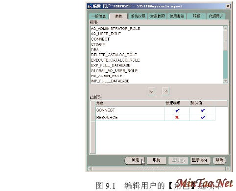(2)以system用户、SYSDBA身份登录数据库后,在【企业管理器】中按照修改用户的步骤进行操作,直到出现如图9.1所示的编辑用户的【角色】选项卡。
