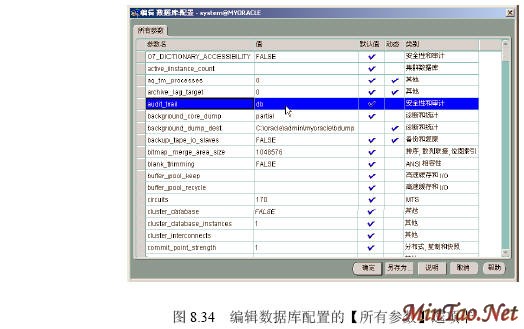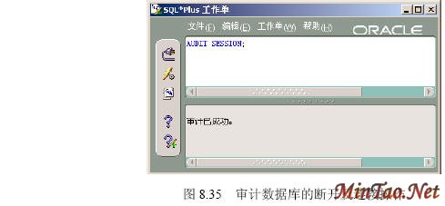 审计的作用 1.审查可疑的活动 2.监视和收集关于指定数据库活动的数据 审计的类型 1.语句审计(STATEMENT AUDITING) 2.权限审计(PRIVILEGE AUDITING) 3.对象审计(OBJECT AUDITING) 审计的信息 AUD$表记录的审计信息包括。 SESSIONID:会话的数字ID。 ENTRYID:审计信息项的ID。 STATEMENT:每个执行的命令的数字ID。 TIMESTAP#:设计信息生成的日期和时间。 USERID:被审计的用户使用的Oracle用户ID。 USERHOST:被审计的用户使用的数据库例程的数字ID。 TERMINAL:被审计的用户的操作系统终端描述字。 ACTION#:被审计的操作的标识。 RETURNCODE:每个被审计的命令执行后的返回代码,若为0,表明操作成功。 OBJ$CREATOR:被一个操作影响到的对象的创建者(对操作审计)。 OBJ$NAME:被一个操作影响到的对象的名称(对操作审计)。 AUTH$PRIVILEGES:使用的系统权限。 AUTH$GRANTEE:使用的对象权限。 NEW$OWNER:在列NEW_NAME中命名的对象的所有者。 NEW$NAME:在列NEW_NAME中命名的对象的名称。 SES$ACTIONS:会话小结的字符串,记录了不同操作的成功和失败的信息。 SES$TID:会话的事务ID。 LOGOFF$LREAD:在会话中执行的逻辑读个数。 LOGOFF$PREAD:在会话中执行的物理读个数。 LOGOFF$LWRITE:在会话中执行的逻辑写个数。 LOGOFF$DEAD:在会话中检测到的死锁个数。 LOGOFF$TIME:用户退出系统的日期和时间。 COMMENT$TEXT:对设计信息项的文本注释。 CLIENTID:客户机ID。 SPARE1:备用。 SPARE2:备用。 OBJ$LABEL:与对象关联的标签。 SES$LABEL:与会话关联的标签。 PRIV$USED:执行操作的系统权限。 SESSIONCPU:会话占用的CPU时间。 审计的启动 如图8.34所示的编辑数据库配置的【所有参数】选项卡。 审计的实例 (1)以SYSTEM用户登录【SQLPlus Worksheet】,执行如下SQL代码,执行结果如图8.35所示。 ――――――――――――――――――――――――――――――――――――― AUDIT SESSION; ――――――――――――――――――――――――――――――――――――― 【参见光盘文件】:第8章\auditsession.sql。 (2)以SCOTT用户登录另外一个【SQLPlus Worksheet】。 (3)查询AUD$表的内容,主要的审计信息如下。 ――――――――――――――――――――――――――――――――――――― SESSIONID:518 ENTRI\YID:1 STATEMENT:1 TIMESTAMP#:13-二月 -2003 11:28:24 AM USERID:SCOTT TERMINAL:MYNETSERVER ACTION#:100 RETURNCODE:0 COMMENT$TEXT:Authenticated by: DATABASE; Client address: ADDRESS=(PROTOCOL=tcp)(HOST=128.0.0.1)(PORT=1088)) SPARE1:MYNETSERVER\Administrator PRIV$USED:5 ―――――――――――――――――――――――――――――――――――――