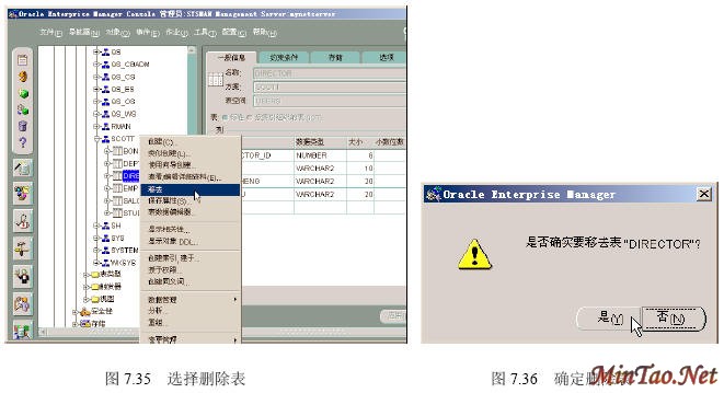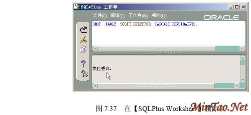 数据表的删除比较简单,表删除后其占用的空间就被系统释放和回收,表的删除是无法回滚的操作。可删除的内容包括。 表的定义 表中的数据 表中的索引 表中的约束条件 表上的触发器 表中的权限 在【企业管理器】里删除表 (1)如图7.35所示。 (2)出现如图7.36所示界面。 (3)对应上述删除数据表director的SQL代码为如下。 ――――――――――――――――――――――――――――――――――――― DROP TABLE SCOTT.DIRECTOR CASCADE CONSTRAINTS; ――――――――――――――――――――――――――――――――――――― 【参见光盘文件】:\第7章\ dropdirector.sql。 (4)在【SQLPlus Worksheet】中执行dropdirector.sql的结果如图7.37所示。 截断和删除的比较 TRUNCATE对所有的表的操作速度都很快,DELETE操作由于要产生大量的回滚信息,所以如果表很大,则删除速度较慢。 TRUNCATE是DDL语言(数据定义语言),隐含了提交操作,因此不能回滚。 TRUNCATE在表上或者在所有的索引中重新设置阈值,由于全部扫描操作和索引全表的快速操作将读所有未超过阈值的数据块,因此DELETE操作以后全表扫描的性能不会改进,但TRUNCATE操作以后全表扫描速度将加快。 截断表时,表和所有索引的存储参数可以设置为初始值,但DELETE操作不能缩小一个表及索引的大小。 截断操作不能删除完整性约束条件,而DELETE操作可以删除。