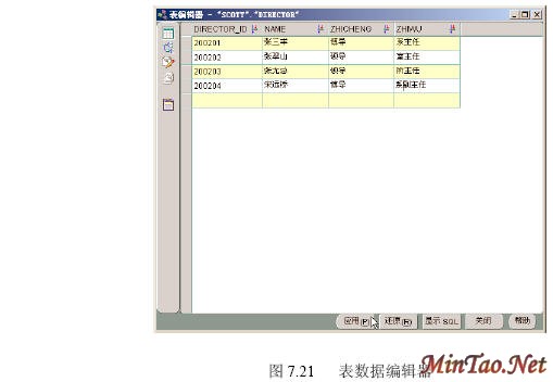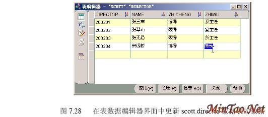 (1)图7.28所示为数据表编辑器界面。在表格中直接将“DIRECTOR_ID”为“200204”的导师的“ZHIWU”由“系副主任”更改为“院长”。