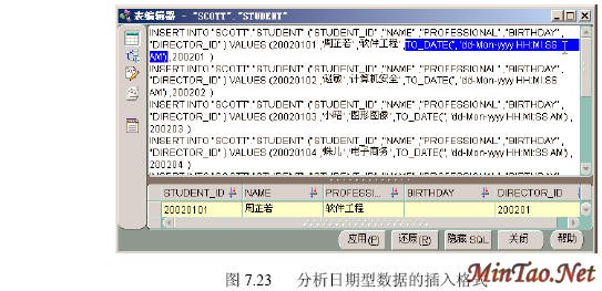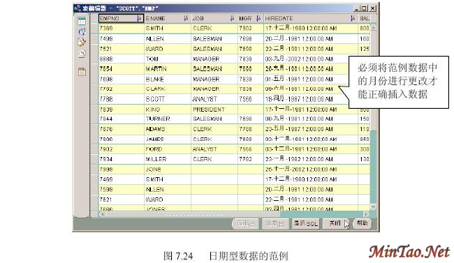 (3)分析出格式还不一定能够正确录入日期型数据。这里告诉读者一个笔者摸索出来的简便的办法。在scott用户下有一个数据表emp,其中有一个hiredate字段是日期型的。