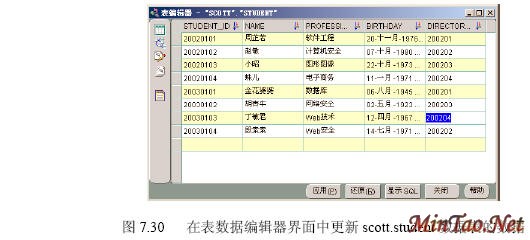 (1)在表数据编辑器中将研究生编号STUDENT_ID为“20030103”的研究生的导师编号字段DIRECTOR更改为200204,如图7.30所示。