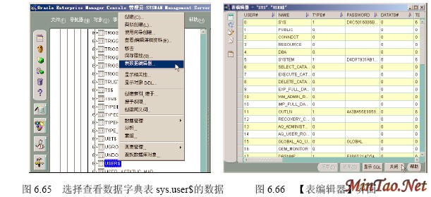 6.11.1 什么是数据字典 数据字典实际上也是以数据表和视图为主要存在形式的。可以这样说,数据字典是关于数据的数据表和视图。 6.11.1 如何使用数据字典 (1)如图6.65所示。 (2)出现如图6.66所示的【表编辑器】界面。 (3)其他数据字典表和视图的内容查看这里不再一一列举。总之,管理员可以通过数据字典获得全面的数据库信息。