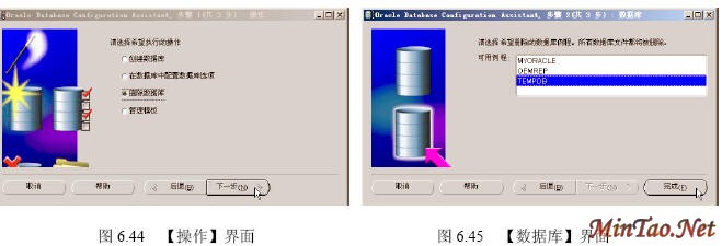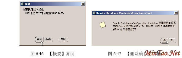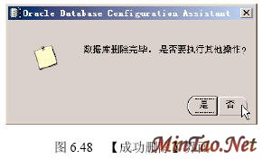 (1)启动【数据库配置助手】,一直到出现如图6.44所示的【操作】界面。 (2)出现如图6.45所示的【数据库】界面。 (3)出现如图6.46所示的【概要】界面。 (4)出现如图6.47所示的【删除确认】界面。 (5)成功删除数据库后出现如图6.48所示的【成功删除】界面。单击“否”按钮。