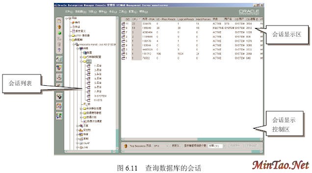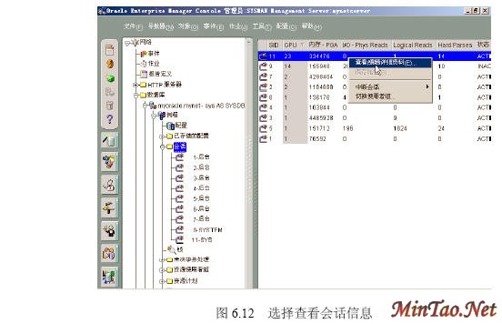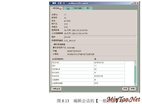 6.5.1 什么是会话 会话(Session)是Oracle数据库服务器对连接数据库的用户进行记录的一种手段。 6.5.2 会话有什么内容 (1)如图6.11所示的会话界面。如果数据库会话很多,显示的将是使用数据库例程资源的前几个会话。 (2)在【会话显示控制区】里可以设置显示会话的方法。 (3)单击【自定义】按钮按照任何所选的会话统计信息排序。 (4)在【会话显示区】下选择会话【11】单击鼠标右键,在出现的快捷菜单里选择【查看/编辑详细资料】菜单选项,如图6.12所示。 (5)出现如图6.13所示的编辑会话的【一般信息】选项卡。 主要的信息如表6.3所示。 表6.3 会话的主要信息