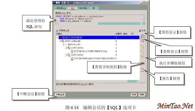 (6)图6.14所示为编辑会话的【SQL】选项卡。 (7)图6.15所示为编辑会话的【统计信息】选项卡。 (8)图6.16所示为编辑会话的【锁】选项卡。