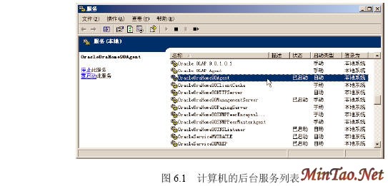一个完整的Oracle 9i的运行网络,包括以下4个部分。 数据库服务器 【管理服务器】 Oracle HTTP服务器 管理客户机 6.1.1 确保数据库服务器的正常运行 要确保数据库服务器正常运行,就是要确保数据库服务器的后台服务正常启动。计算机上所有的服务列表,如图6.1所示。 其中与数据库服务器有关的服务包括。 OracleOraHome90Agent:【智能代理】的后台服务。 OracleOraHome90TNSListener:监听程序对应的后台服务。 OracleServiceMYORACLE:【全局数据库名】为myoracle.mynet的数据库的服务。 OracleServiceOEMREP:【全局数据库名】为oemrep的数据库的服务。 6.1.2 确保【管理服务器】的正常运行 要确保【管理服务器】正常运行,就是要确保【管理服务器】对应的后台服务正常启动。在图6.1中与【管理服务器】有关的后台服务包括。 OracleOraHome90ManagementServer:【管理服务器】的后台服务。 OracleServiceOEMREP :【管理服务器】需要使用的后台数据库。 6.1.3 确保Oracle HTTP服务器的正常运行 要确保Oracle HTTP服务器的正常运行,就是要确保Oracle HTTP服务器对应的后台服务正常启动。在图6.1中与【管理服务器】有关的后台服务为OracleOraHome90HTTPServer。 6.1.4 确保管理客户机的正常运行 要确保管理客户机的的正常运行,主要有两点。 确保通信网络连接通畅,请参见本书2.1.5节。 确保【网络服务名】配置无误,请参见本书2.3.2节。