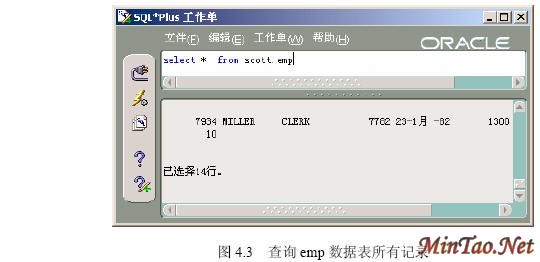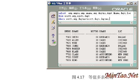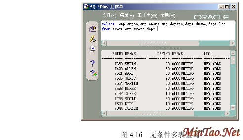 所谓多表查询是相对单表而言的,指从多个数据表中查询数据,这里我们主要学习从两个数据表中如何查询数据的方法。 4.3.1 无条件多表查询 无条件多表查询是将各表的记录以“笛卡尔”积的方式组合起来。 如scott.dept表共有4条记录,scott.emp表共有14条记录,其“笛卡尔”积将有4*14=56条记录。 在【命令编辑区】执行下列语句。 ―――――――――――――――――――――――――――――――――――――― select emp.empno,emp.ename,emp.deptno,dept.dname,dept.loc from scott.emp,scott.dept; ―――――――――――――――――――――――――――――――――――――― 单击【执行】按钮,出现如图4.16所示的结果。 【参见光盘文件】:\第4章\4.3\431.sql。 4.3.2 等值多表查询 在【命令编辑区】执行下列语句。 ――――――――――――――――――――――――――――――――――――― select emp.empno, emp.ename, emp.deptno, dept.dname,dept.loc from scott.emp,scott.dept where scott.emp.deptno=scott.dept.deptno; ――――――――――――――――――――――――――――――――――――― 单击【执行】按钮,出现如图4.17所示的结果。 【参见光盘文件】:\第4章\4.3\432.sql。 等值多表查询将按照等值的条件查询多个数据表中关联的数据。要求关联的多个数据表的某些字段具有相同的属性,即具有相同的数据类型、宽度和取值范围。 4.3.3 非等值多表查询 在【命令编辑区】执行下列语句。 ――――――――――――――――――――――――――――――――――――― select emp.empno, emp.ename, emp.deptno, dept.dname,dept.loc from scott.emp,scott.dept where scott.emp.deptno!=scott.dept.deptno and scott.emp.deptno=10; ――――――――――――――――――――――――――――――――――――― 单击【执行】按钮,出现如图4.18所示的结果。 【参见光盘文件】:\第4章\4.3\433.sql。 在非等值多表查询中,读者可以使用表4.1所示的比较运算符来组合查询条件。