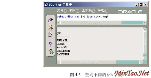 在图4.4所示的job字段中,可以发现有相同的数据,为了查询有多少种不同的job,在【命令编辑区】输入“select distinct job from scott.emp”,然后单击【执行】按钮,出现如图4.5所示的结果。