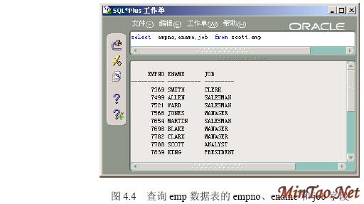 在【命令编辑区】输入“select empno,ename,job from scott.emp”,然后单击【执行】按钮,将显示emp数据表的empno、ename和job字段,如图4.4所示。