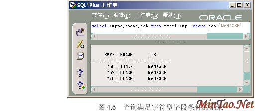 (1)在【命令编辑区】输入“select empno,ename,job from scott.emp where job=’MANAGER’”,然后单击【执行】按钮,出现如图4.6所示的字符型字段条件查询的结果,查询的是job为MANAGER的记录。
