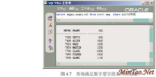 (2)在【命令编辑区】输入“select empno,ename,sal from scott.emp where sal<=2500”,然后单击【执行】按钮,出现如图4.7所示的数字型字段条件查询的结果,查询的是满足sal小于等于2500的记录。