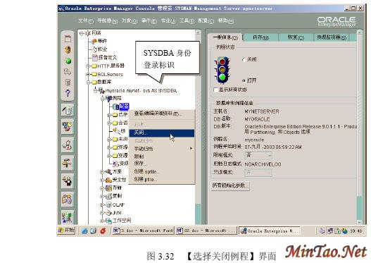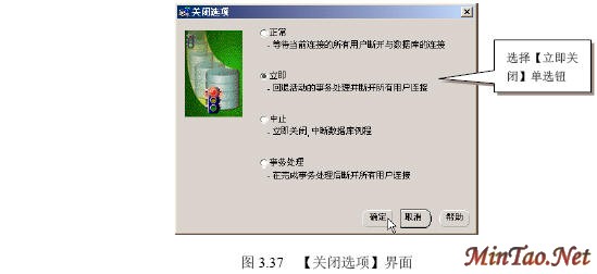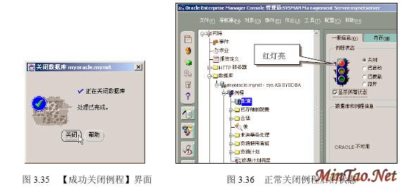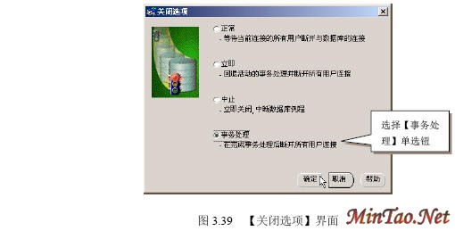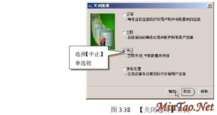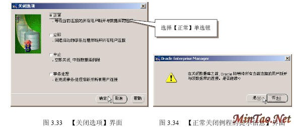 3.5.3 正常关闭 (1)如图3.30所示。 (2)出现如图3.31所示的【数据库连接信息】界面。 (3)出现如图3.32所示界面。 (4)出现如图3.33所示的【关闭选项】界面。 (5)出现如图3.34所示的【正常关闭例程的提示信息】界面。 (6)成功关闭例程后出现如图3.35所示界面。 (7)出现数据库配置的【一般信息】选项卡,如图3.36所示。 3.5.4 立即关闭 (1)在图3.37所示的【关闭选项】界面里选择【立即】单选钮。 (2)关闭完毕,出现如图3.35所示界面。 3.5.5 中止关闭 (1)图3.38所示【关闭选项】界面。 (2)关闭完毕,出现如图3.35所示界面。 3.5.6 事务处理关闭 (1)在图3.39所示的【关闭选项】界面里选择【事务处理】单选钮。 (2)关闭完毕,出现如图3.35所示界面。
