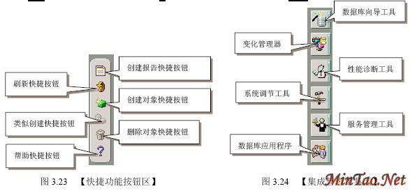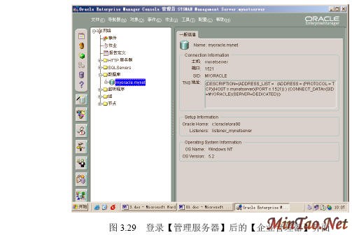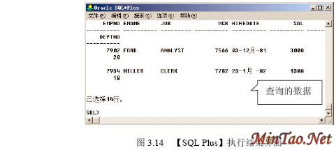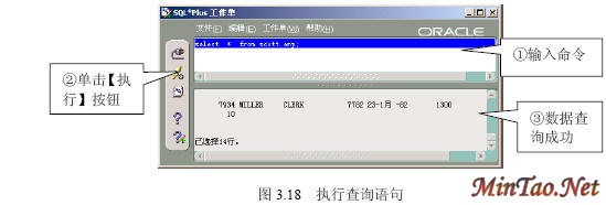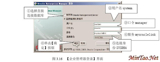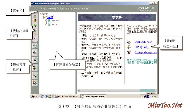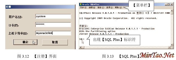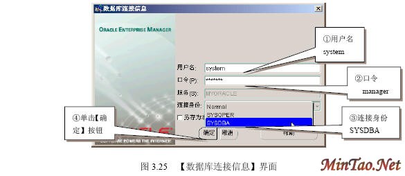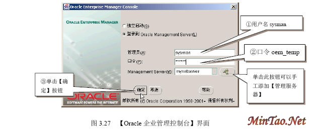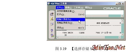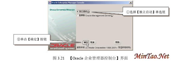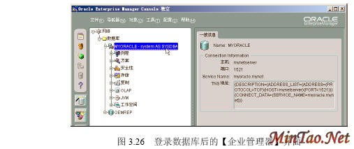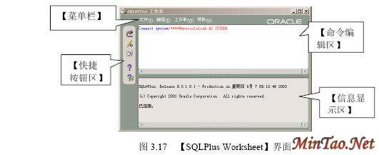 3.4.1 【SQL Plus】的使用 (1)如图3.12所示的【注册】界面。 (2)成功连接数据库后出现如图3.13所示的【SQL Plus】界面。 (3)输入查询语句“select * from scott.emp;”(查询scott用户下的emp数据表的所有记录),执行结果如图3.14所示。 (4)执行完毕后,输入quit或exit将返回到Windows状态。 (5)按照图3.12登录的【system】用户实际上只具有“Normal”权限。如果要使用户按照“sysdba”或者“sysoper”权限登录,必须显式指明登录身份。如图3.15所示。 3.4.2 【SQLPlus Worksheet】的使用 (1)如图3.16所示的【企业管理器登录】界面。 (2)出现如图3.17所示的【SQLPlus Worksheet】界面,主要包括4大部分。 (3)在【命令编辑区】输入“select * from acott.emp;”,然后在【快捷按钮区】单击【执行】按钮,结果如图3.18所示。 (4)在【菜单栏】选择【文件】/【将输入另存为】命令,如图3.19所示。 (5)出现如图3.20所示的【将工作单另存为】界面。 3.4.3 【企业管理器】的使用 1. 独立登录 (1)出现如图3.21所示的【Oracle企业管理器控制台】界面。 (2)出现如图3.22所示的【独立启动后的企业管理器】界面。 (2)【菜单栏】有6项内容。 (3)【快捷功能按钮区】共有6个快捷按钮,如图3.23所示。 (4)【集成管理工具区】共有6大类集成管理工具,如图3.24所示。 (5)【管理目标导航器】集中管理数据库对象,必须先连接数据库后才能显示。【管理目标显示区】将显示该类别下的所有对象。 (6)要对数据库实行管理首先必须登录数据库,在【企业管理器】里也叫连接。在【管理目标导航器】里双击【网络】/【数据库】/【MYORACLE】选项,出现如图3.25所示的【数据库连接信息】界面。 (7)出现如图3.26所示的登录数据库后的【企业管理器】界面,就可以对数据库进行详细的管理了。 2. 登录【管理服务器】 (1)如图3.27所示的【Oracle企业管理控制台】界面。 (4)出现如图3.28所示的【安全警告】界面。 (5)成功登录管理服务器后的企业管理器如图3.29所示。