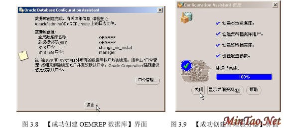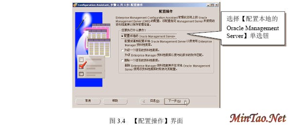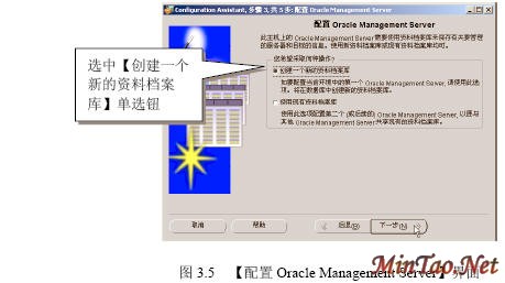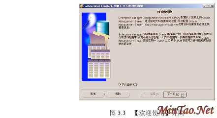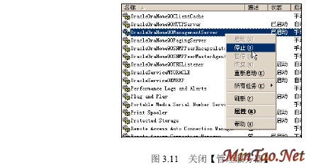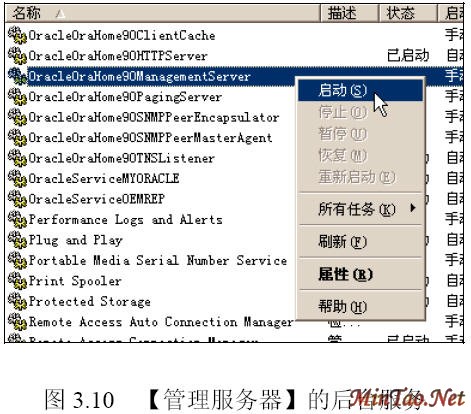 【管理服务器】是Oracle 9i安装光盘中一个可以单独进行安装的组件。 3.2.1 配置环境 下面介绍在笔者的安装环境下如何配置【管理服务器】,配置的环境如下。 【计算机名称】:mynetserver。 【IP地址】:192.168.100.89。 【全局数据库名】:myoracle.mynet。 3.2.2 配置步骤 (1)如图3.3所示的【欢迎使用】界面。 (2)出现如图3.4所示的【配置操作】界面。 (3)出现如图3.5所示的【配置Oracle Management Server】界面。 (4)出现如图3.6所示的【创建新资料档案库选项】界面。 (5)出现如图3.7所示的【创建资料档案库概要】界面。 (6)系统将调用【数据库配置助手】创建数据库。 (7)成功配置【管理服务器】后出现如图3.9所示界面,单击"关闭"按钮。 3.2.3 【管理服务器】的启动和关闭 (1)有两个后台服务与管理服务器有关,如图3.10所示。 (2)若要启动【管理服务器】,在【OracleOraHome90ManagementSever】服务上用鼠标右键单击,在出现的快捷菜单中选择【启动】选项,系统将自动启动【管理服务器】。 (3)在已启动的【OracleOraHome90ManagementSever】服务上用鼠标右键单击,在出现的快捷菜单中选择【停止】选项,系统将自动关闭【管理服务器】,如图3.11所示。