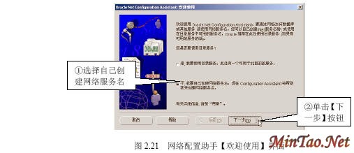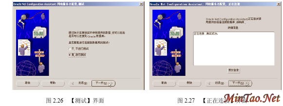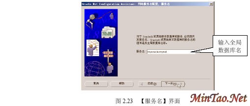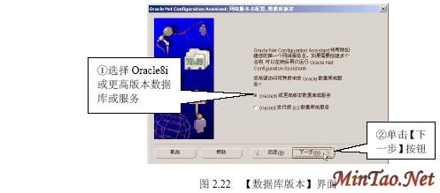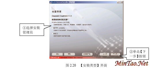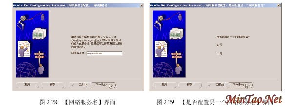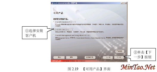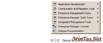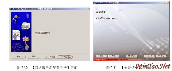2.2.1 安装步骤 (1)出现如图2.19所示的【可用产品】界面。 (2)出现如图2.20所示的【安装类型】界面。 (3)出现同服务器安装类似的【摘要】界面。 (4)在安装进程进行到99%和100%时出现同服务器安装类似的【磁盘位置】界面。 (5)出现如图2.21所示的Oracle Net Configuration Assistant(Oracle网络配置助手)的【欢迎使用】界面。 (6)出现如图2.22所示的【数据库版本】界面。 (7)出现如图2.23所示的【服务名】界面。 (8)出现如图2.24所示的【请选择协议】界面。 (9)出现如图2.25所示的【TCP/IP协议】界面。 (10)出现如图2.26所示的【测试】界面。 (11)出现如图2.27所示的【正在连接】界面。 (12)出现如图2.28所示的【网络服务名】界面。 (13)出现如图2.29所示的【是否配置另一个网络服务名】界面。 (14)出现如图2.30所示的【网络服务名配置完毕】界面。 (15)出现如图2.31所示的【安装结束】界面。 2.2.2 安装结果 客户机的程序组,如图2.32所示。 表2.3 Oracle 9i管理客户机的程序组