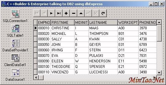 现在当您打开 TClientDataSet 的时候,它会发送一个对数据的请求给 TDataSetProvider,TDataSetProvider 就会打开 TSQLTable 组件并从 DB2 employee 表中检索记录(通过到 DB2 数据库的 TSQLConnection)。