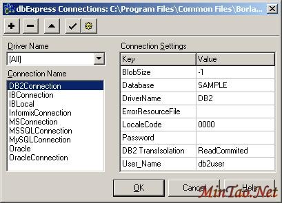 您可以使用 DriverName 属性选择一个驱动程序,例如 DB2、InterBase、MYSQL 或者 Oracle。然而,您通常已经在 ConnecionName 中定义了特定的(到特定数据库的)连接信息,所以您也可以使用那个属性,并选择 DB2Connection 值。一旦设置好了 DriverName 或者 ConnectionName 属性值,其它的属性就会同时自动地得到一个值,例如 GetDriverFunc、LibraryName 和 VendorLib 属性。
