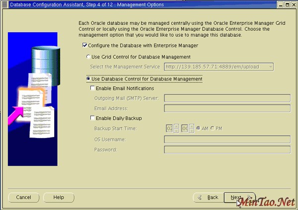 7. 出现 Management Options 页面。 为了使用 Enterprise Manager,选择 Configure the Database with Enterprise Manager 。 选择 Use Database Control for Database Managemen t 以本地管理您的数据库或选择适合您的配置的 Use Grid Control for Database Management 。单击 Next 。