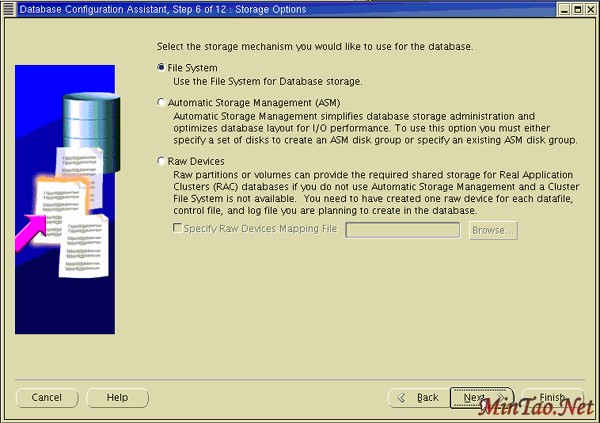 9. 选择适合您的环境的 File System 、Automatic Storage Management 或Raw Devices 。单击 Next 。