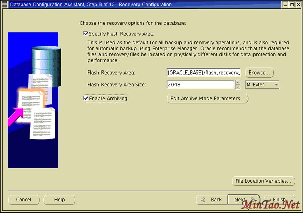 11. 选择 Flash Recovery Area 并指定目录位置和大小。 选择 Enable Archiving 将您的数据库置于 ARCHIVELOG 模式。单击 Next 。