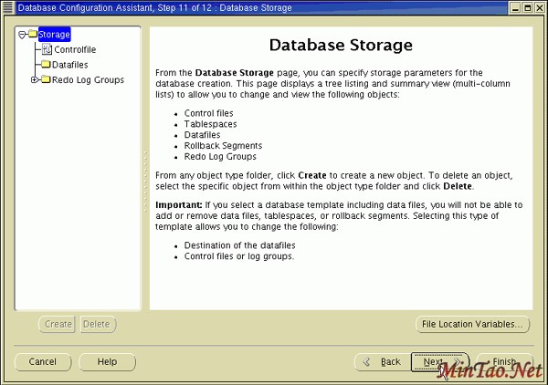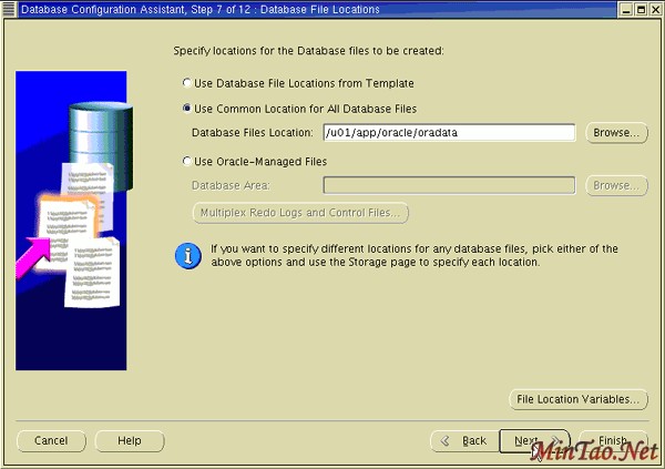 10. 指定创建 datafiles 的位置。 选择其一:Use Database File Locations from Template 、Use Common Location for All Database Files 或 Use Oracle-Managed Files 。单击 Next 。