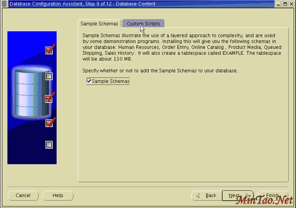 12. 单击 Sample Schemas 选项卡。 如果您想在您的数据库中包含示例模式 (EXAMPLE ) 表空间,请选择 Sample Schemas 。 单击 Custom Scripts 选项卡。
