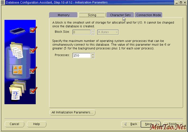 15. 出现 Sizing 页面。 指定能够同时连接到数据库的最小的块空间和作多的操作系统用户进程数量。